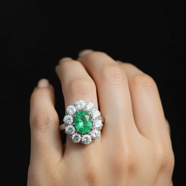 Nemesfém: 14 kt-os fehérarany - Felület: fényes, ródiumozott - Gyűrűméret: 55 mm - Tömeg (kb.): 4 g - Kő, drágakő: smaragd, gyémánt