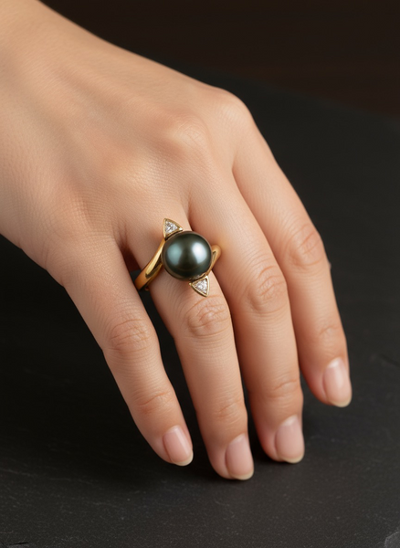 14 kt-os Egyedi arany brilles gyűrű gyönggyel. Kézzel készített, exkluzív, női gyűrű, mely remek választás egy komoly alkalomra.