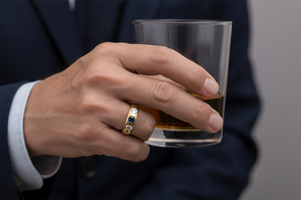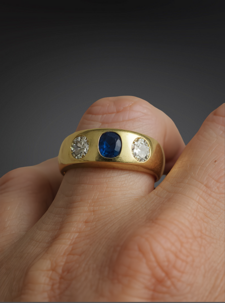 580%o - es arany antik bécsi brilliáns, zafír gyűrű (1872-1892). Klasszikus alliance gyűrű, amely az antik ékszerek kedvelői számára kitűnő választás. Mérete alapján férfi gyűrűnek készülhetett.