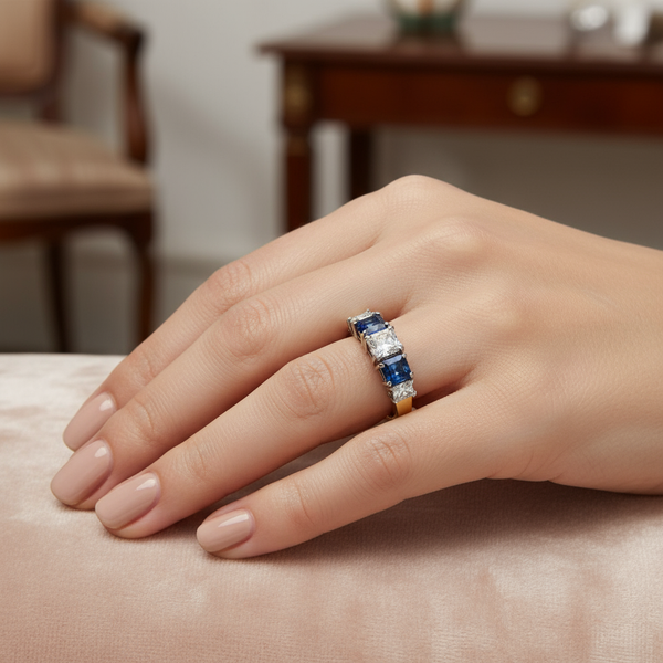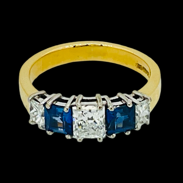 Nemesfém: 18 kt-os sárga arany - Felület: fényes, polírozott Gyűrűméret: 52 mm - Tömeg (kb.): 4,7 g - Kő, drágakő: gyémánt, zafír